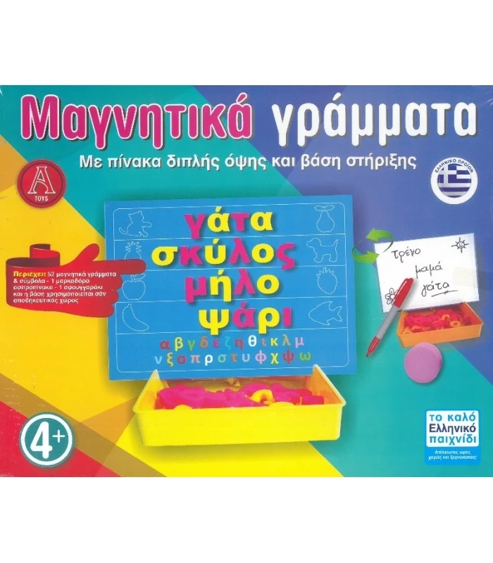 Μαγνητικά γράμματα με πίνακα διπλής όψης και βάση στήριξης.