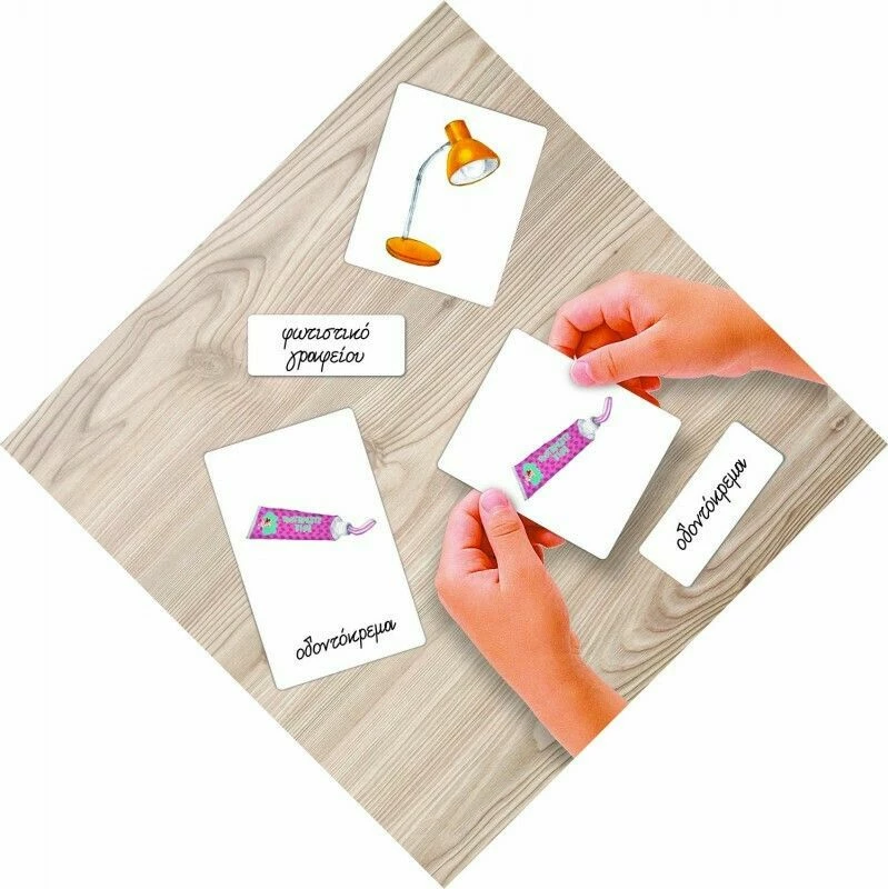 Το παιδί καλείται να ταιριάξει τις κάρτες με τις εικόνες με εκείνες με τις αντίστοιχες λέξεις. Ο στόχος είναι να τονωθεί η ανάπτυξη του λεξιλογίου με φυσικό τρόπο!