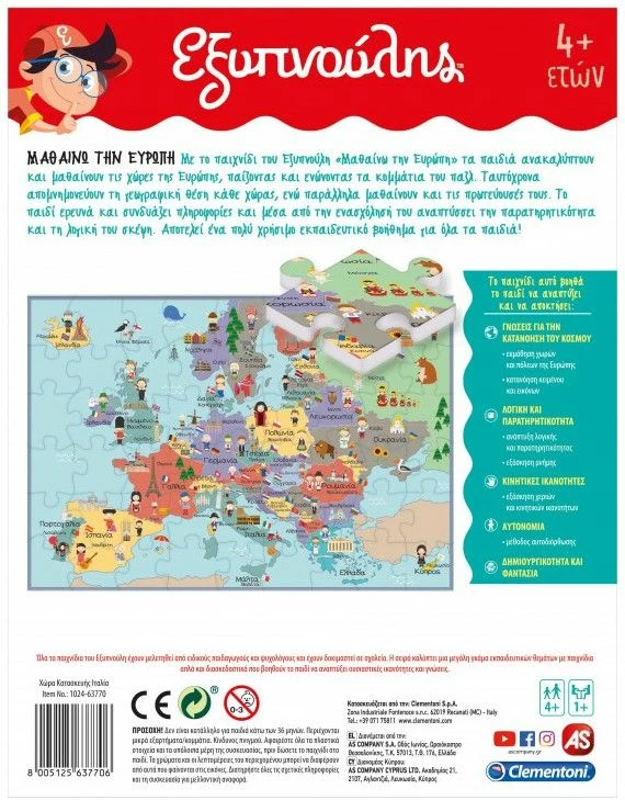 Με το παιχνίδι του Εξυπνούλη Μαθαίνω την Ευρώπη τα παιδιά ανακαλύπτουν και μαθαίνουν τις χώρες της Ευρώπης, παίζοντας και ενώνοντας τα κομμάτια του παζλ. Ταυτόχρονα απομνημονεύουν τη γεωγραφική θέση κάθε χώρας ενώ μαθαίνουν τα ονόματα των πρωτευουσών και των μεγαλύτερων πόλεών τους. Το παιδί ερευνά και συνδυάζει πληροφορίες και μέσα από την ενασχόλησή του αναπτύσσει την παρατηρητικότητα και τη λογική του σκέψη. Αποτελεί ένα πολύ χρήσιμο εκπαιδευτικό βοήθημα για όλα τα παιδιά!