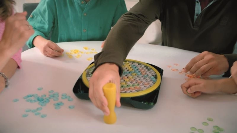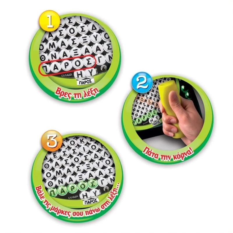 Το πιο γρήγορο και διασκεδαστικό ΚΡΥΠΤΟΛΕΞΟ για πολλούς παίκτες! Βρες τη λέξη, πάτα την κόρνα και τοποθέτησε τις μάρκες σου πάνω της.Κάνε γρήγορα! Οι άλλοι παίκτες μπορούν να βρουν λέξεις που συνδέονται με τα γράμματα των δικών σου λέξεων και να αφαιρέσουν μερικές από τις μάρκες σου.Ο παίκτης με τις περισσότερες μάρκες στο κρυπτόλεξο, στο τέλος του παιχνιδιού, κερδίζει.Περιλαμβάνει ειδική βάση παιχνιδιού, 16 διαφορετικά κρυπτόλεξα, μάρκες σε 4 διαφορετικά χρώματα και κόρνα.