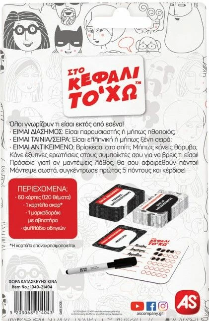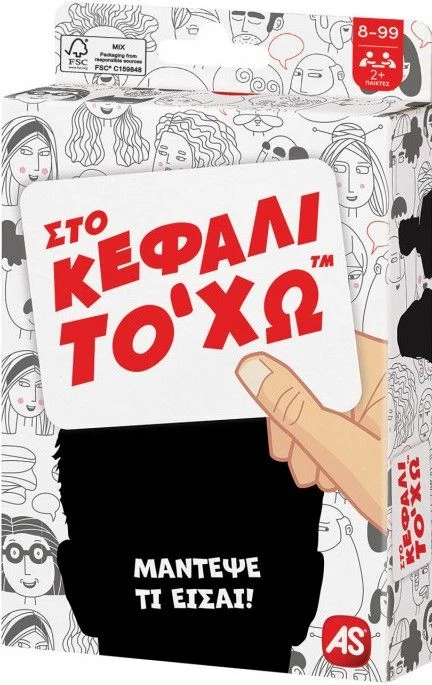 Όλοι γνωρίζουν τι είσαι εκτός από εσένα! Είσαι διάσημος, ταινία ή αντικείμενο; Κάνε έξυπνες ερωτήσεις για να βρεις τι κρύβεται στην κάρτα που κρατάς στο κεφάλι σου. Συγκέντρωσε πρώτος 5 πόντους και κέρδισε! Αριθμός Παικτών: 2+ Καταλληλότητα Ηλικίας: 8-99 Χρονών Το παιχνίδι περιλαμβάνει – 60 κάρτες με 120 θέματα – 1 καρτέλα σκορ (επαναχρησιμοποιείται) – 1 μαρκαδοράκι με σβηστήρα – Φυλλάδιο οδηγιών