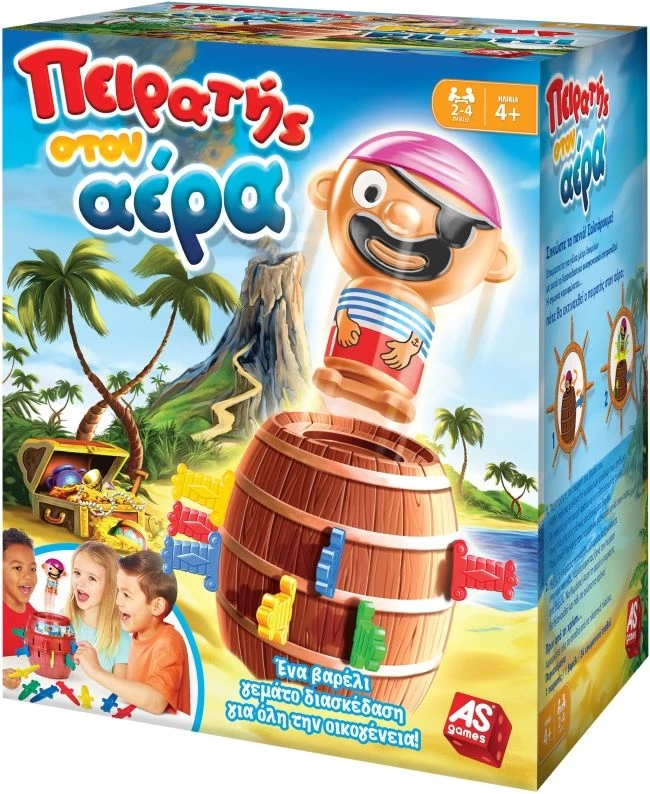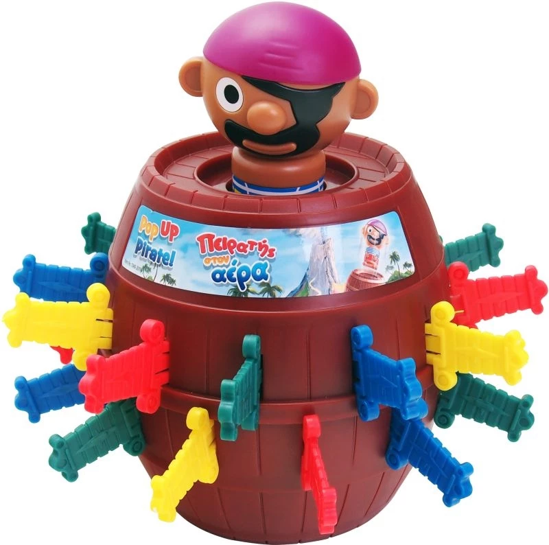 Ο πειρατής ψάχνει τον θησαυρό και εγκλωβίζεται κατά λάθος στο βαρέλι! Κάθε παίκτης με τη σειρά τοποθετεί ένα σπαθί στο βαρέλι. Προσέξτε! Μία λάθος κίνηση μπορεί να κάνει τον πειρατή να πεταχτεί στον αέρα!