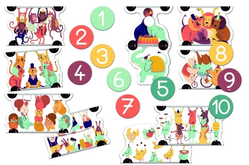 Χάρη στις κάρτες των ζώων και τις μάρκες των αριθμών, τα παιδιά θα μάθουν να συσχετίζουν τους αριθμούς με τις ποσότητες και να τους βάζουν σε αύξουσα σειρά, σχηματίζοντας ένα διασκεδαστικό και πολύχρωμο πύργο με ζωάκια.