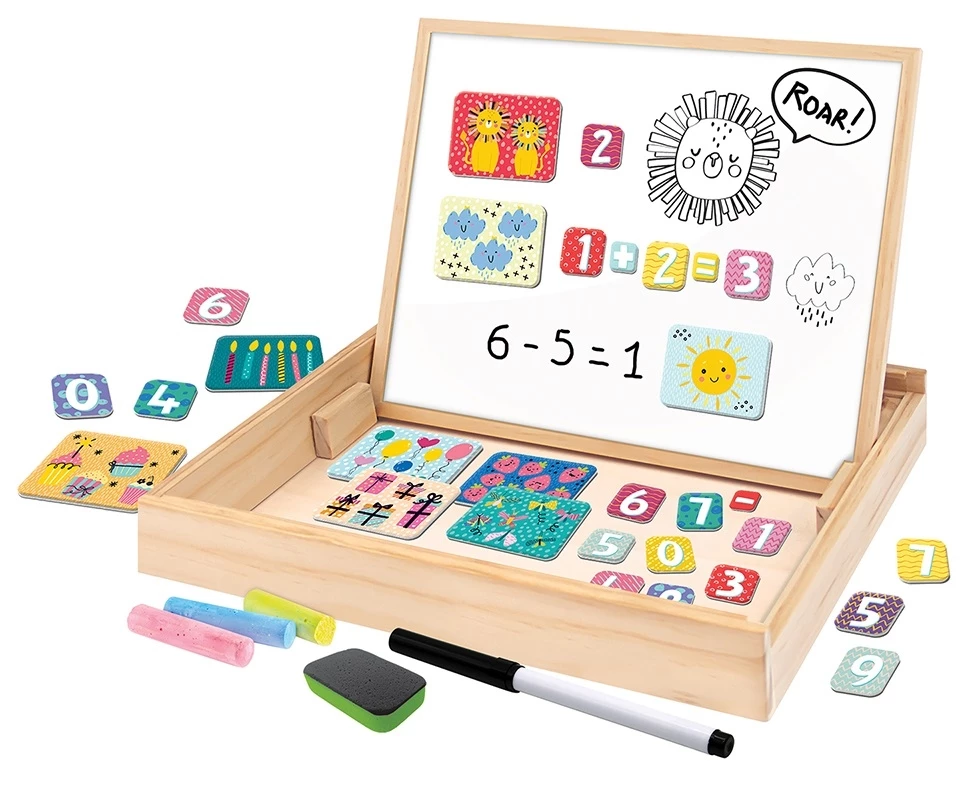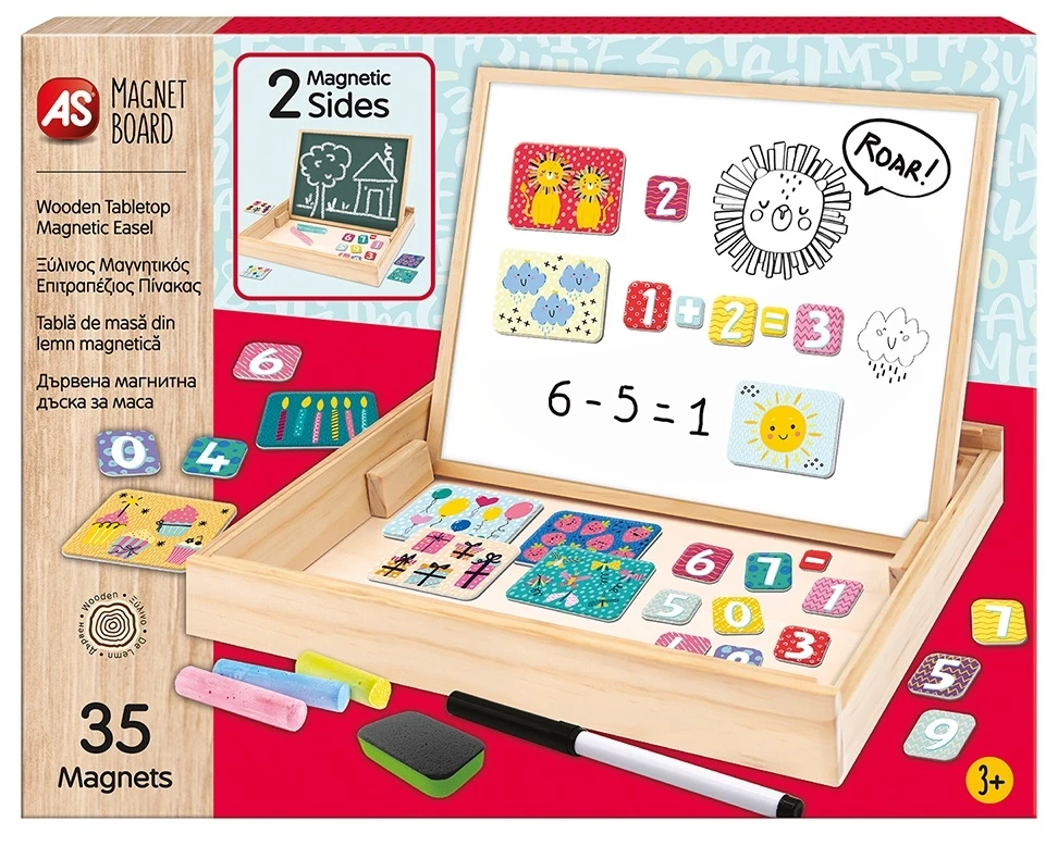 Επιτραπέζιος μαγνητικός πίνακας δύο όψεων. Η μία όψη του αποτελεί μαυροπίνακα για κιμωλίες και η άλλη όψη του πίνακα μαρκαδόρου. Και οι 2 πλευρές του είναι μαγνητικές, ώστε να μπορεί το παιδί να χρησιμοποιήσει όλα τα σετ μαγνητών της σειράς. Εξαιρετικά εύκολο στη μετακίνηση, για δημιουργικότητα και παιχνίδι χωρίς όρια! Το σετ περιλαμβάνει τον επιτραπέζιο μαγνητικό πίνακα, 1 σφουγγαράκι, 1 μαρκαδόρο, 3 κιμωλίες και 35 μαγνήτες. Ιδανικό για την ανάπτυξη της φαντασίας και της δημιουργικότητας στην πιο πρακτική μορφή.