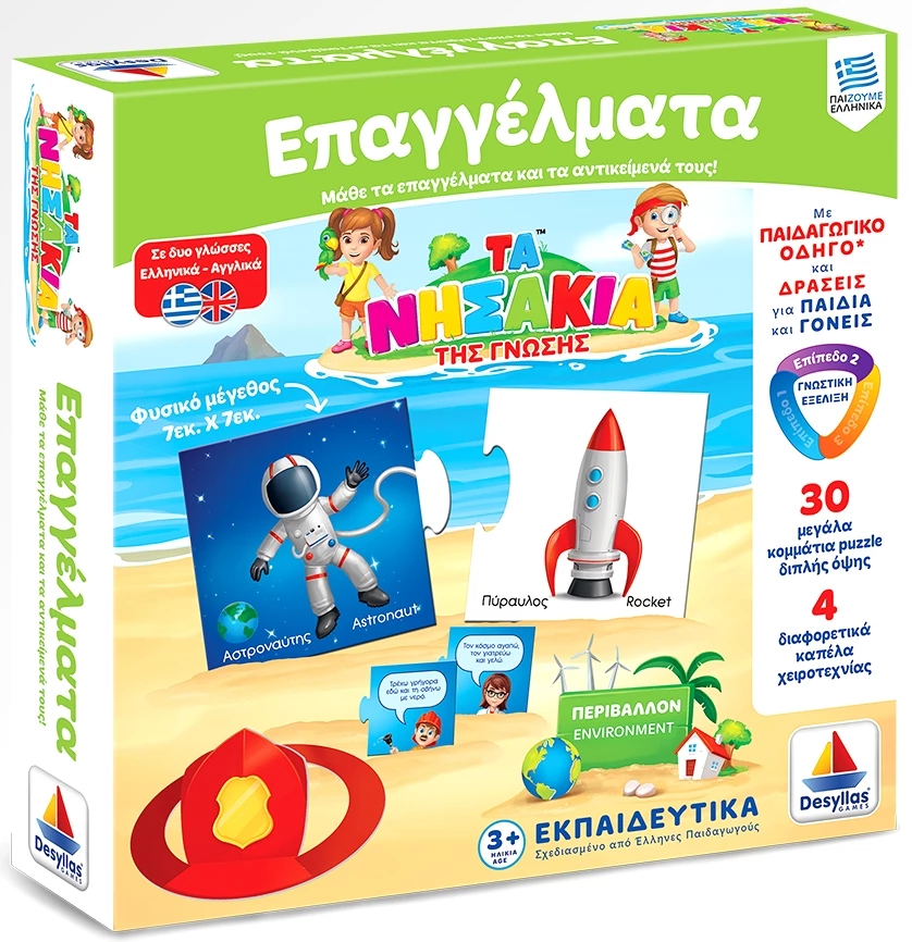 Ταίριαξε τα επαγγέλµατα µε τα αντικείµενά τους! Τι στολή φοράει; Ποια αντικείµενα χρησιµοποιεί; Εσύ τι θα γίνεις όταν µεγαλώσεις; Μάθε παίζοντας και διασκεδάζοντας, στα ελληνικά και στα αγγλικά. Κατασκεύασε και φόρεσε τα 4 διαφορετικά καπέλα και γίνε ο πυροσβέστης, ο αστυνοµικός, ο γιατρός και ο µάγειρας για ατελείωτες ώρες παιχνιδιού!