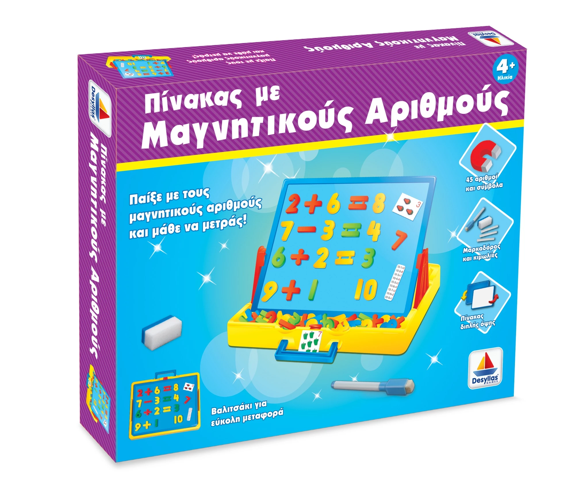 Περιέχει 45 μαγνητικούς αριθμούς, εικόνες, μαρκαδόρος, κιμωλίες… Ένας πίνακας 2 όψεων, όπου το παιδί μπορεί να κάνει πράξεις με τους μαγνητικούς αριθμούς, να ζωγραφίσει με τις κιμωλίες ή να γράψει με το μαρκαδόρο.