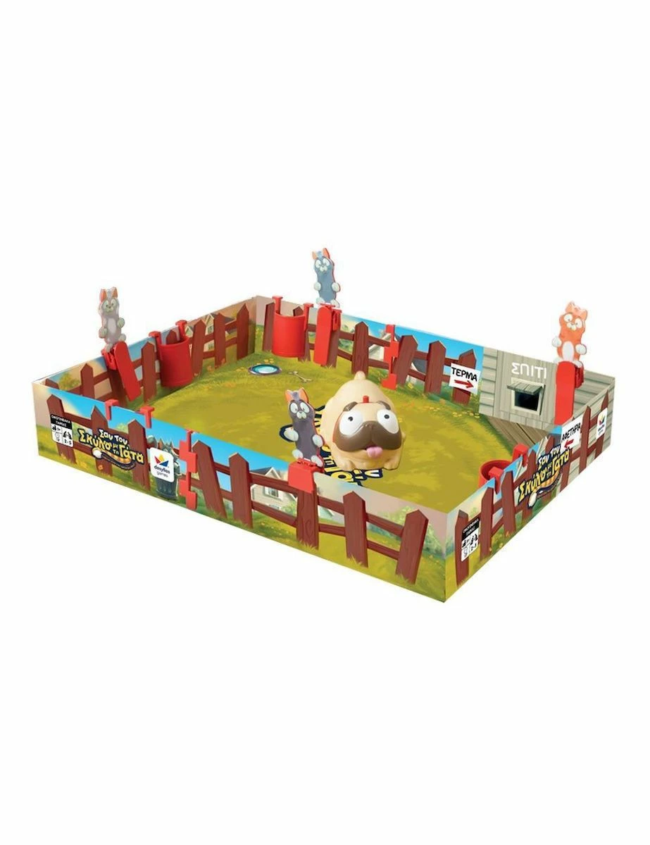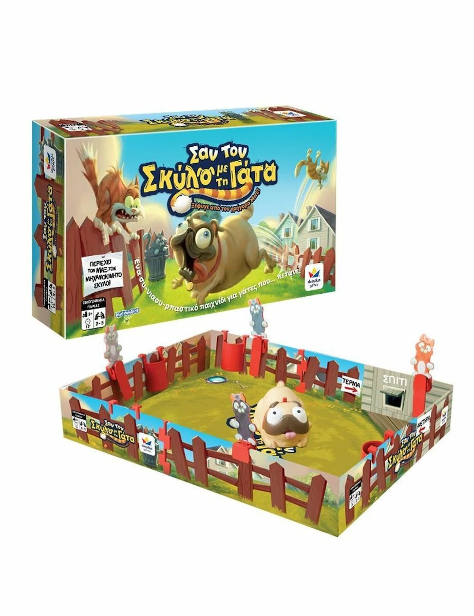 Desyllas Games – Σαν τον Σκύλο με τη Γάτα, ένα συναρπαστικό επιτραπέζιο για παιδιά. Γατούλες προσέξτε! Ο Μαξ έχει βγει στην αυλή! Μη φοβάσαι όμως. Αν η γατούλα σου κρύβεται μέσα σε σκουπιδοτενεκέ, είναι ασφαλής, ο Μαξ δεν μπορεί να την πειράξει! Κάνε πρώτος με τη γάτα σου τον γύρο της αυλής και κέρδισε! Ένα συ-νιαου-ρπαστικό παιχνίδι για γάτες που… πετάνε!