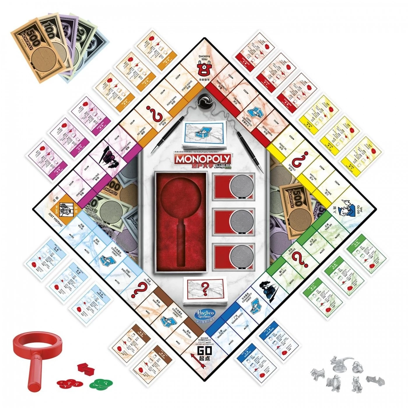 Περιλαμβάνει ταμπλό παιχνιδιού, πλαστικό αποκωδικοποιητή, 6 πιόνια, 22 κάρτες Τίτλων Ιδιοκτησίας, 24 κάρτες Εντολής, 14 κάρτες Απόφασης, 12 μάρκες αποκωδικοποιητή από χαρτόνι, 12 ξενοδοχεία, 2 ζάρια, δεσμίδα χαρτονομισμάτων και οδηγίες παιχνιδιού.