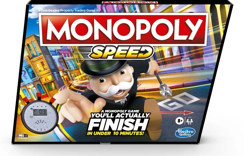 Δεν έχετε πολύ χρόνο; Κανένα πρόβλημα! Για να παίξετε το επιτραπέζιο Monopoly Ταχύτητας χρειάζεστε λιγότερο από 10 λεπτά! Όλοι οι παίκτες ρίχνουν το ζάρι και αγοράζουν ταυτόχρονα, οπότε δεν χρειάζεται να περιμένετε τη σειρά σας. Στη διάρκεια 4 γύρων, οι παίκτες αγωνίζονται ενάντια στον χρόνο για να αγοράσουν, να ανταλλάξουν και να πουλήσουν τις ιδιοκτησίες τους πιο γρήγορα από ποτέ. Ο χρόνος μετράει αντίστροφα για κάθε στάδιο αγοραπωλησίας. Το επιτραπέζιο παιχνίδι Monopoly Ταχύτητας είναι μια πολύ καλή επιλογή για μια οικογενειακή βραδιά, για πάρτι με φίλους αλλά και ένα γρήγορο διάλειμμα από την καθημερινότητα!
