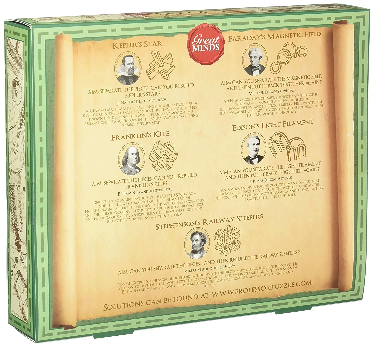 Μια εκπληκτική συλλογή από τους καλύτερους κλασσικούς μεταλλικούς και ξύλινους γρίφους όλων των εποχών και αφαιρεμένο σε 5 μεγάλες προσωπικότητες της επιστήμης.