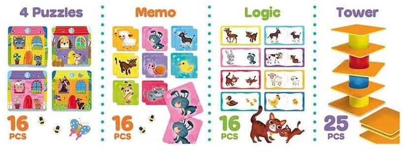 Αυτό το παιχνίδι απευθύνεται σε μικρότερα παιδιά, περιλαμβάνει 4 παιχνίδια: παζλ, παζλ μνήμης, παζλ λογικής και πλαστικά σχήματα. Το παιδί σας θα διασκεδάσει, αναπτύσσοντας λογικές δεξιότητες σκέψης, μνήμης και μαθαίνοντας τα σχήματα και τα ζώα.