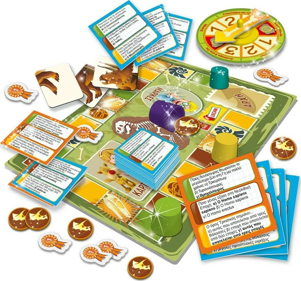 Μια µεγάλη περιπέτεια γνώσεων στον προϊστορικό κόσµο! Ένα παιχνίδι γνώσεων βασισµένο σε προγράµµατα δηµοτικού σχολείου για να ανακαλύψετε και να µάθετε για τον κόσµο των δεινοσαύρων και των πρωτόγονων ανθρώπων. Χάρη στα τρία επίπεδα δυσκολίας, παιδιά διαφορετικών ηλικιών µπορούν να παίξουν µαζί. Απαντήστε στις ερωτήσεις διασκέδασης, προχωρήστε στο ταµπλό και µαζέψτε τις µάρκες! Διαστάσεις Μ:27xΠ:27.5xΥ:7 εκ. Κατάλληλο για παιδιά ηλικίας 5-10 ετών.