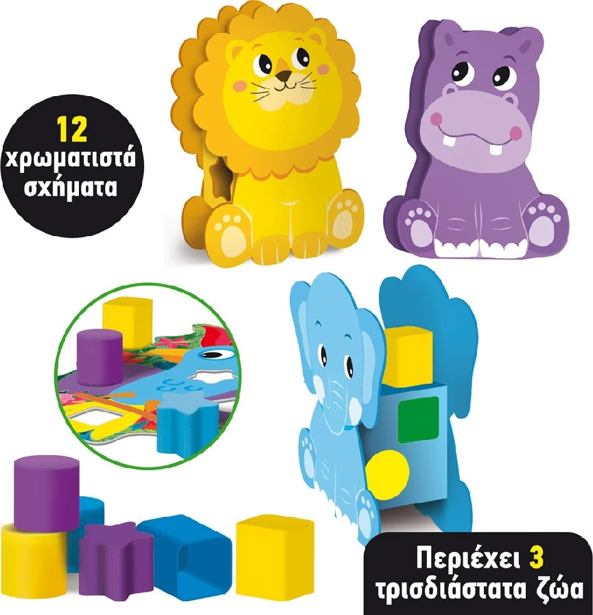 Tρία συμπαθητικά τρισδιάστατα ζωάκια για να μάθει το παιδί για τα σχήματα και χρώματα ευχάριστα. Κάθε ζώο συνδυάζεται με κάποια από τα 12 χρωματιστά πλαστικά σχήματα. Το σετ περιέχει επίσης πολύχρωμο παιχνίδι με τον ξεκαρδιστικό παπαγάλο!Mε αυτή την πλούσια συλλογή παιχνιδιών, το παιδί αναπτύσσει τις ακόλουθες Ικανότητες Ζωής που προσδιορίστηκαν από τον Παγκόσμιο Οργανισμό Yγείας:Iκανότητα επίλυσης προβλημάτων, τοποθετώντας τα σχήματα στο σωστό μέρος, συναίσθηση και δημιουργικότητα, παίζοντας ελεύθερα με τα ζώα και τα σχήματα.