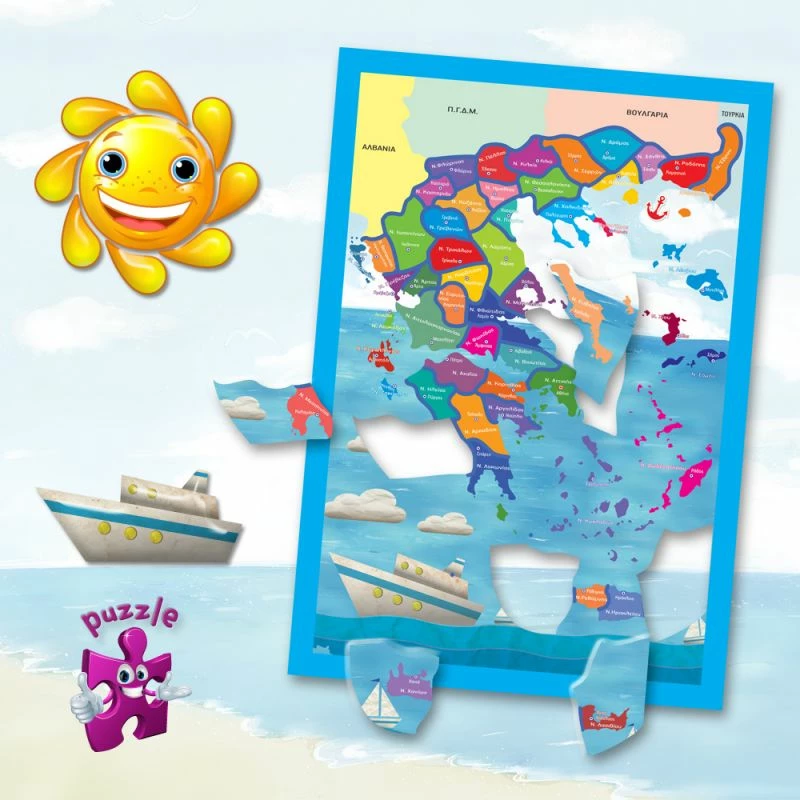 Περιλαμβάνει ταμπλό 35 χ 50 με τα σύνορα της χώρας μας και 52 κομμάτια παζλ με τους νομούς που πρέπει να μπουν στη σωστή θέση για να ολοκληρωθεί ο χάρτης της Ελλάδας.